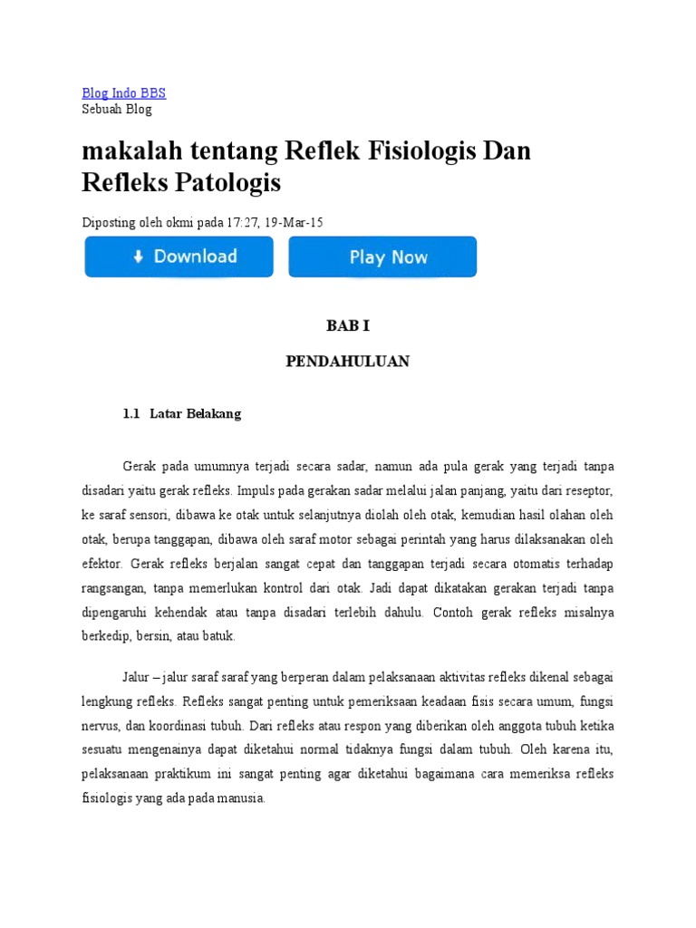 Bab i pendahuluan 1.1 latar belakang masalah pencemaran lingkungan merupakan masalah kita bersama, yang semakin penting. Saraf spinal lengkung refleks , saraf spinal yang mempunyai bagian sensorik dan motorik berperan dalam menimbulkan refleks superfisial dan tendon dalam. Pembuluh darah melebarsaraf otonom : Selamat datang di pakdosen.co.id, web digital berbagi ilmu pengetahuan. Jenis gerak refleks berdasarkan tingkat kompleksitas neuron (saraf) refleks monosynaptic atau pun juga monosegmental, ini yang hanya banyak melibatkan pada 1 segmen dari sistem saraf pusat, refleks multisynaptic (atau juga intersegmental) , yang kemudian akan melibatkan lebih dari 1 segmen dari sistem saraf pusat, refleks monosynaptic tersebut juga berarti hanya ada satu neuron yang.
